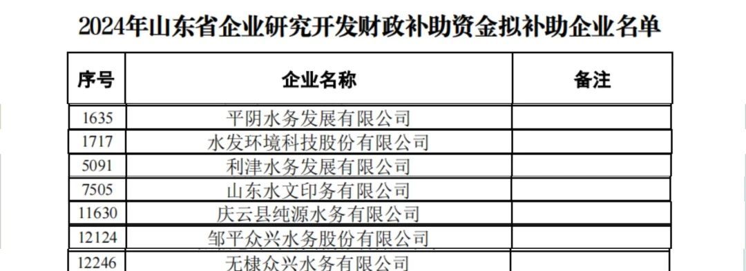 近日,山東省科技廳正式公布了2024年山東省企業(yè)研究開發(fā)財(cái)政補(bǔ)助資金擬補(bǔ)助企業(yè)名單,水發(fā)水控集團(tuán)旗下共有7家企業(yè)成功獲批,取得政府補(bǔ)助33萬(wàn)元。