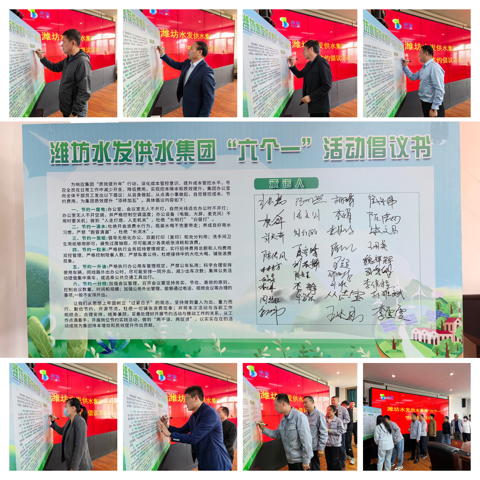 會上,供水集團黨總支書記、董事長張勇首先宣讀了“六個一”活動倡議書,號召全體員工提升降本增效意識,爭做勤儉辦公、節(jié)能降耗的先進(jìn)模范。隨后,供水集團領(lǐng)導(dǎo)班子成員及參加活動的干部職工紛紛在活動展板上簽上自己的名字,承諾自覺踐行“六個一”節(jié)約倡議。