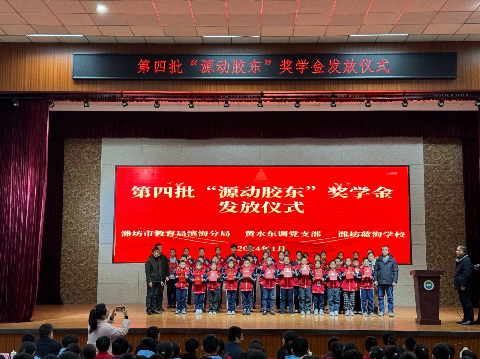 1月17日下午,黃水東調(diào)黨支部聯(lián)合濰坊藍(lán)海學(xué)校在藍(lán)海學(xué)校行政樓報(bào)告廳舉行了第四批“源動(dòng)膠東”獎(jiǎng)學(xué)金頒發(fā)儀式,對(duì)藍(lán)海學(xué)校2023學(xué)年榮獲獎(jiǎng)學(xué)金的42名優(yōu)秀學(xué)生進(jìn)行表彰。濱海區(qū)教育分局黨組成員、副局長(zhǎng)袁玉松,山東水發(fā)黃水東調(diào)工程有限公司黨支部書記、董事長(zhǎng)申勇,總經(jīng)理宋致軍,濰坊藍(lán)海學(xué)校黨支部書記、校長(zhǎng)楊偉平等出席,共計(jì)300余名師生參加此次活動(dòng)。